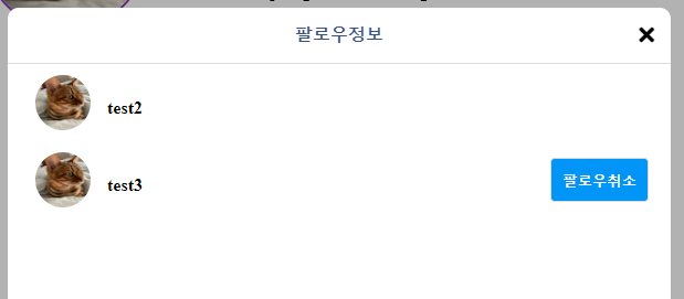 모달에는 팔로우 대상자의 사진과 username, 팔로우 여부, 혹은 본인 여부에 따른 버튼 노출 설정이 필요하다.