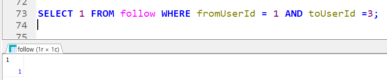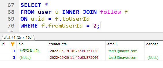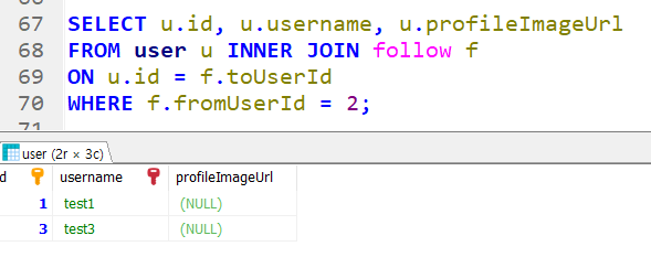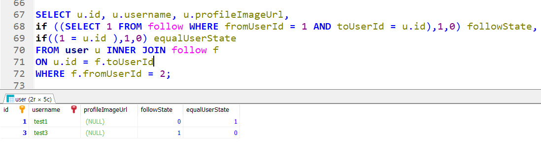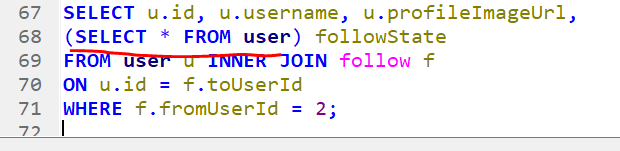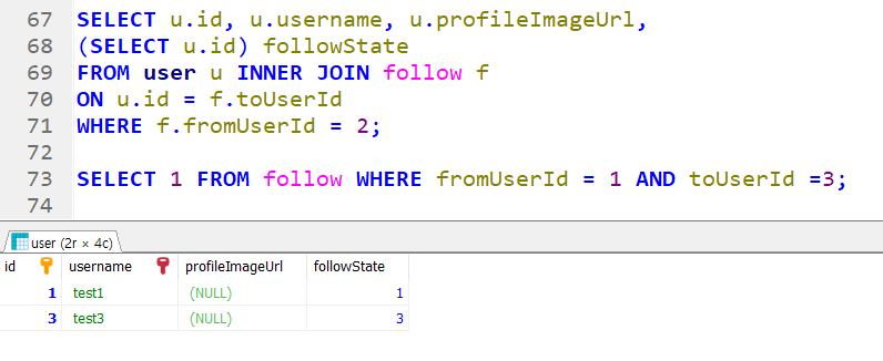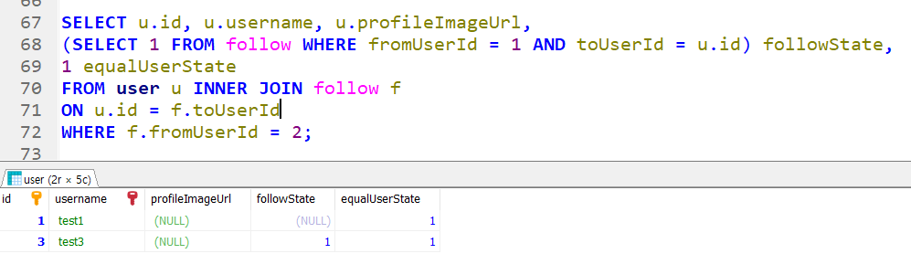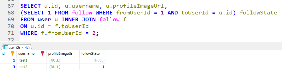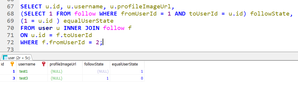 따라서 스칼라서브쿼리에서 아래의 SELECT문(1번 유저가 특정 유저를 팔로하는지 확인하는 쿼리)을 복붙해서