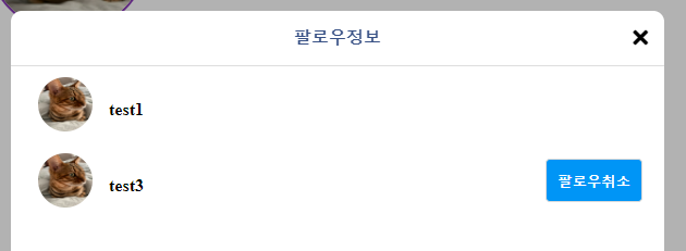 팔로우 모달에서는 1번 유저와, 3번 유저의 정보가 나와야한다.