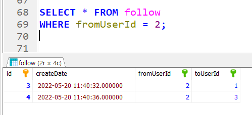 followState 컬럼에는 로그인한 유저(여기선 1번)이 1번 유저를 팔로우 하는지, 또 3번 유저를 팔로우 하는지