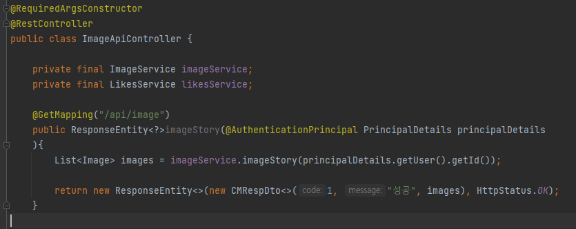 ImageApiController의 imageStory 함수가 등록한 댓글을 뿌려줘야 하는데,
