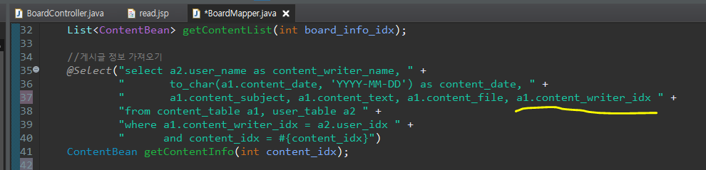->글정보 가져올때 작성자 인덱스 정보도 가져오도록 쿼리문 추가한다