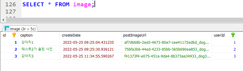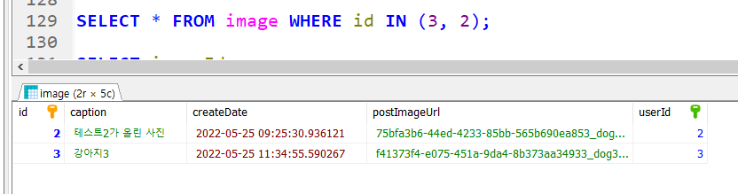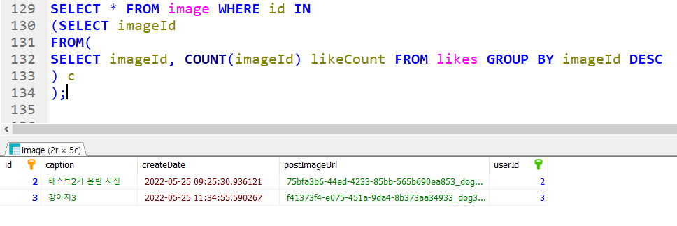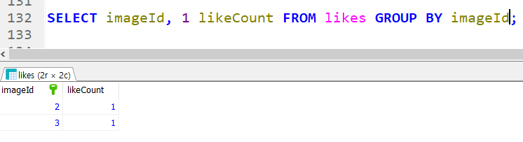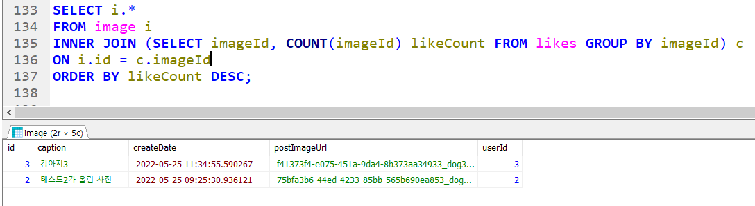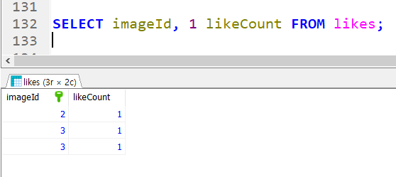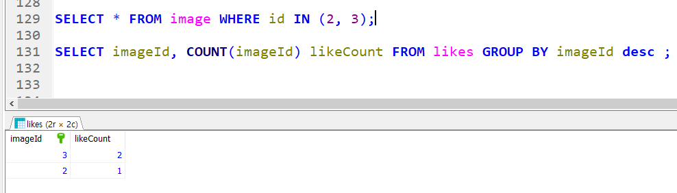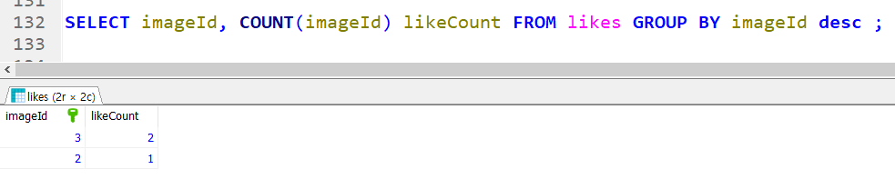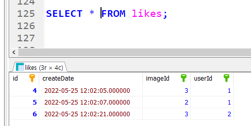 likes 테이블에 보면 3번 이미지는 2개의, 2번 이미지는 1개의 like을 받은 것을 알 수 있다.