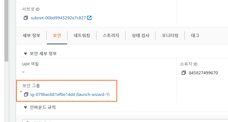 - 사용중인 인스턴스 클릭->보안 ->보안그룹 클릭-> 인바운드 규칙 수정을 클릭한다.
